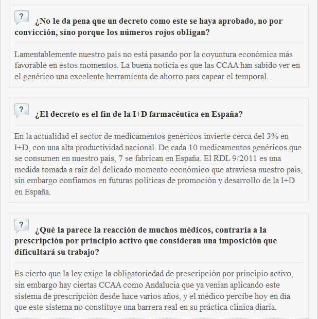 a ley marca la obligación de prescripción por principio activo, expresó su confianza en que las CC.AA sepan implantar este nuevo decreto de forma homgénea. Ante la pregunta sobre el porqué del bajo consumo de genéricos en España, el director general de la Asociación Española de Medicamentos Genéricos, explicó que este factor se debe a la introducción tardía del genérico en nuestro país y su poca promoción por parte de la Administración. De hecho, esto es, en gran parte, lo que le pide al nuevo gobierno que salga tras las elecciones del 20-N… “Medidas legislativas orientadas al desarrollo real del sector de medicamentos genéricos. Un marco legislativo y jurídico que permita establecer planes previsibles y desarrollar un plan sectorial de consenso acorde con la realidad y objetivos perseguidos y, por último, campañas de concienciación e información dirigidas al ciudadano con el objeto de que contribuya de manera activa a garantizar la sostenibilidad del SNS.”